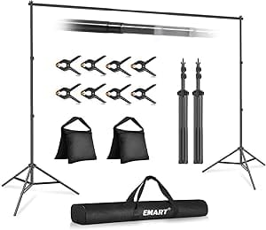 Buy from Amazon > Backdrop Stand 10x7ft(WxH) Photo Studio Adjustable Background Stand Support Kit with 2 Crossbars, 8 Backdrop Clamps, 2 Sandbags and Carrying Bag for Parties Events Decoration